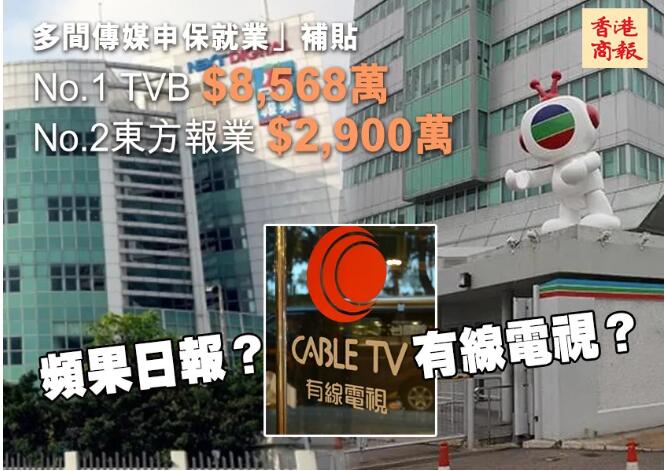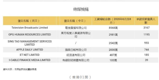 本港多间传媒机构都先后出现在名单之上,包括TVB、有线、东方和苹果等。当中电视广播有限公司(TVB)获发8568万资助位列第一,承诺受薪人数达3,167名员工。