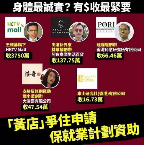 在香港「修例风波」期间,曾参与罢市、并扬言「宁愿没有生意额,也要支持示威」的「黄店」阿布泰生活百货从港府处领取了约137万元的工资补贴;曾污名化新冠肺炎,又屡次煽动「手足」出来示威的知名「黄店」大渣哥也领取了约47.5万元……