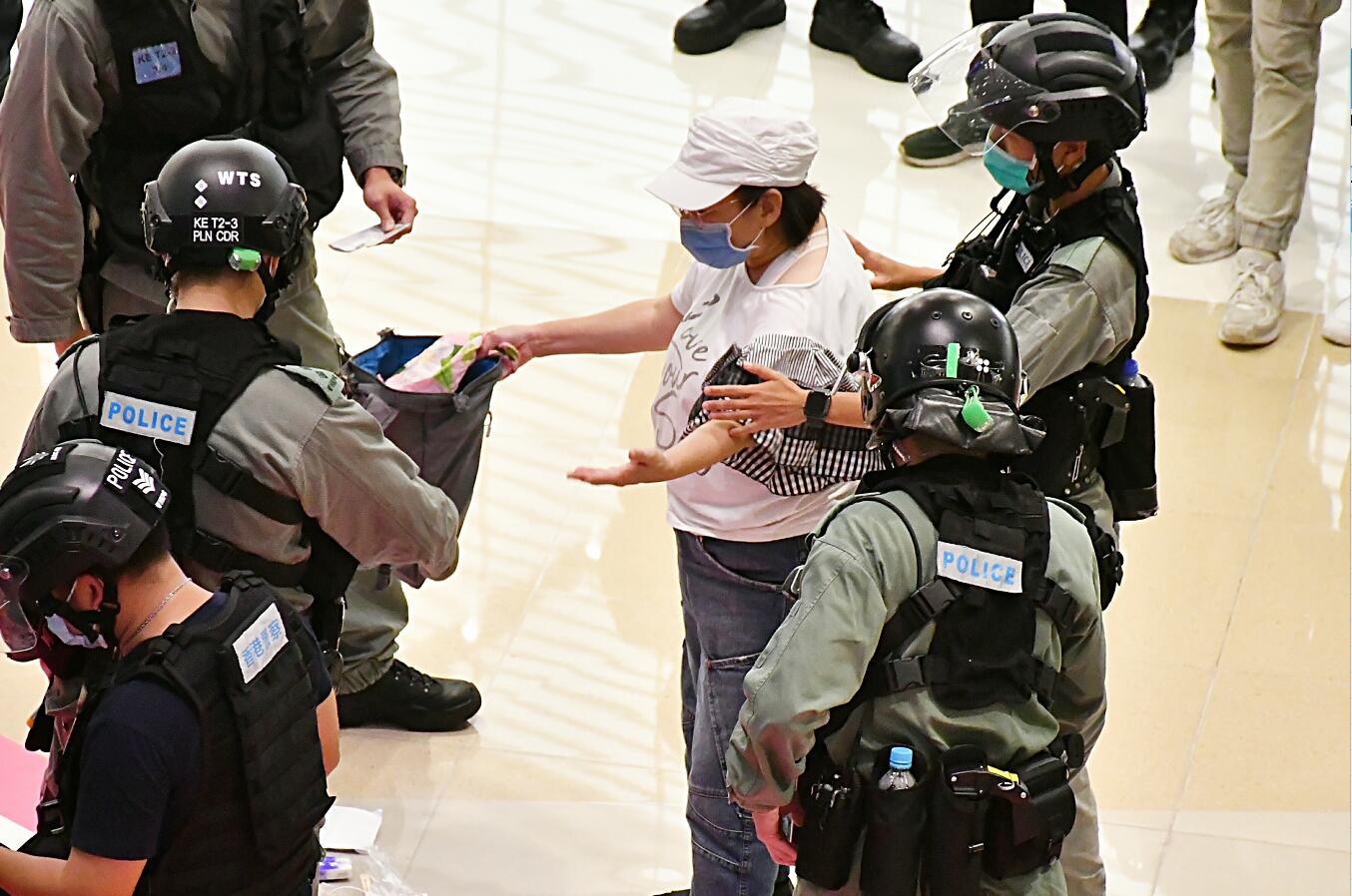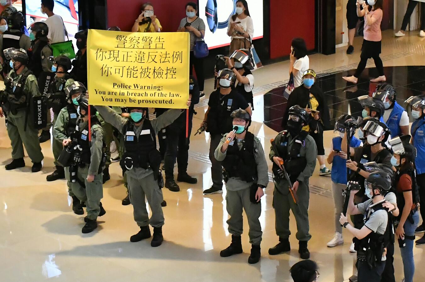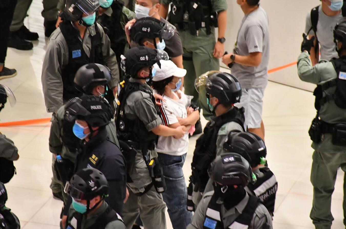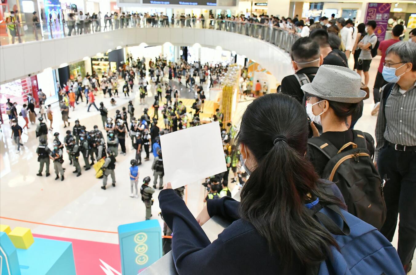 【香港商报网讯】记者冯瀚文摄影报道:有網民今日(6日)晚上6時許於觀塘apm商場發起非法集结,有約數十名市民於商場內聚集,並分散於各樓層,不知是否因為已經通過「國安法」關係,現場民眾未有一如以往高調於場內擺放政治文宣或旗幟,取而代之是部分人士手持白紙並間中仍然有人會高呼口號,包括「五大訴求,缺一不可」、「時代革命」等。約6時半大批防暴警進入商場,在商場中庭多次舉起黃旗警告在場人士,並拉起封鎖線,期間截查多名人士並帶走多人。