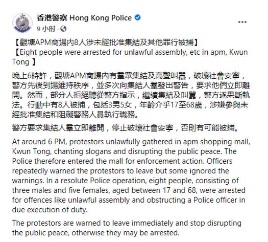 警方要求集結人群立即離開,停止破壞社會安寧,否則有可能被捕。