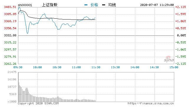 7月7日,A股延續放量上攻勢頭,滬深兩市大幅高開。滬指開盤後站上3400點關口,隨後快速回落,在3370點附近橫盤震蕩,創業板指走勢較強,在科技股帶動下大漲逾3%,站上2600點關口。白酒股集體上漲,“股王”貴州茅台大漲逾5%,逼近1700元大關。盤麵上多數飄紅,電子領漲。題材概念方麵,國家大基金概念領漲。兩市成交再次站上萬億關口,北上資金半日淨流入近百億元。