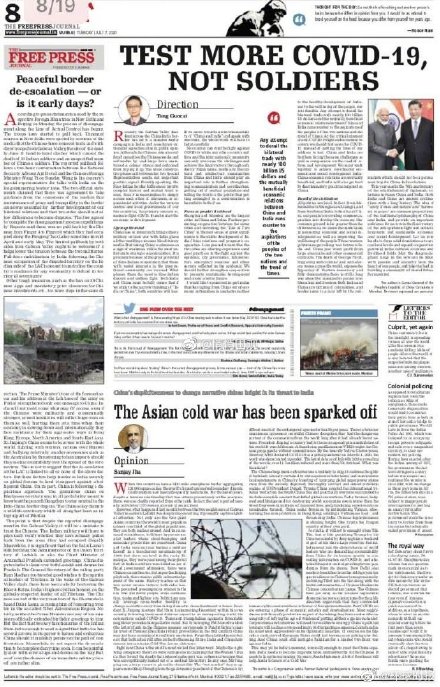 7月7日,中国驻孟买总领事唐国才在印度中西部知名英文媒体《自由新闻日报》发表题为《多测新冠,勿试军心》的署名文章。