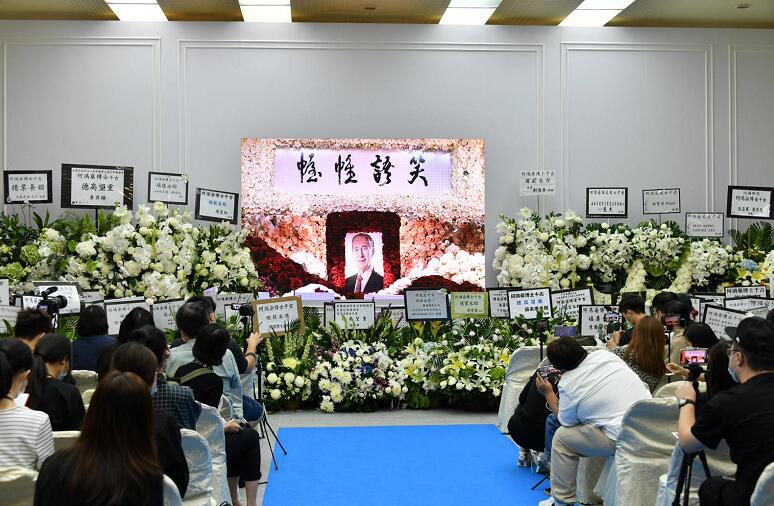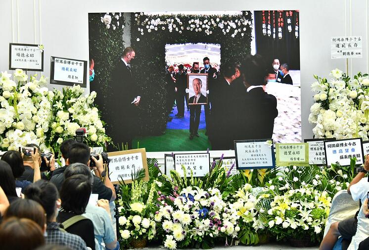 大殮儀式後,「賭王」靈柩移至靈堂,靈柩鋪滿白色花,下午2時半儀式完成,何猷龍捧遺照送別。