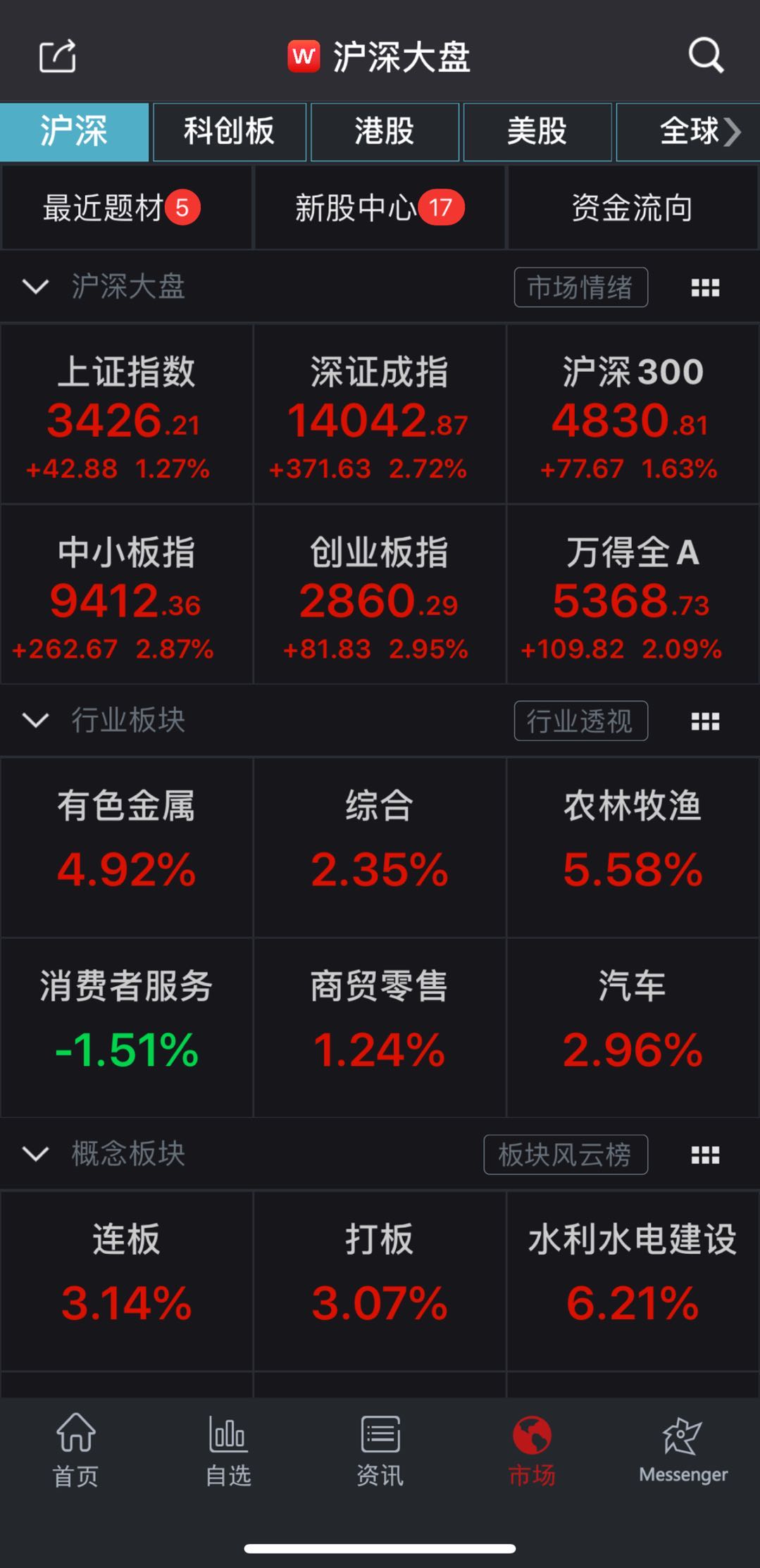 【香港商报网讯】周一(7月13日),A股三大股指全线上涨,沪指涨超1%,创业板指涨近3%,截至发稿,沪指涨1.27%,深成指涨2.72%,创业板指涨2.95%。盘面上,农业、水利建设板块大涨逾6%,有色、建材、白酒、医药等板块涨幅均超3%。