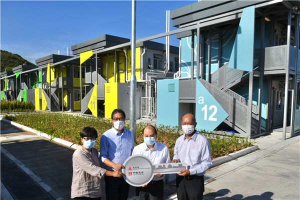 張建宗(右二)昨日到竹篙灣視察新增檢疫單位的興建進度。圖為他與發展局局長黃偉綸(左二)出席接收完工檢疫單位儀式。 中通社
