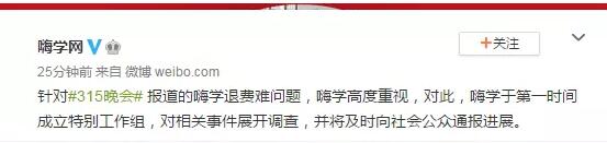 针对3·15晚会报道的嗨学退费难问题,嗨学高度重视,对此,嗨学於第一时间成立特别工作组,对相关事件展开调查,并将及时向社会公众通报进展。