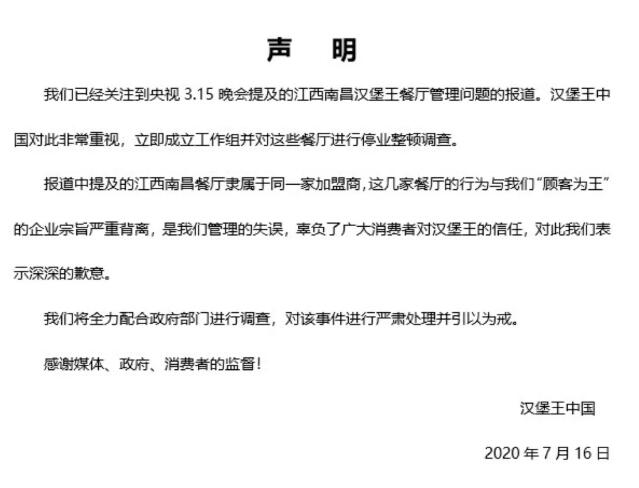 汉堡王回应:深表歉意,已成立工作组对问题餐厅进行停业整顿调查
