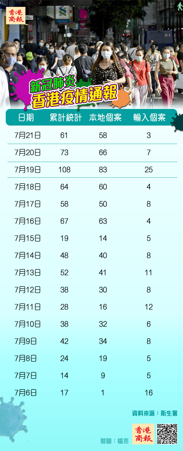 【香港商報網訊】記者何加祺報道:新一波新冠肺炎疫情肆虐,本港昨日再新增61宗確診個案,累計達2018宗。在58宗本地個案中,33宗與之前的群組相關,有25宗源頭不明。疫情爆發下,再多2名患者死亡。