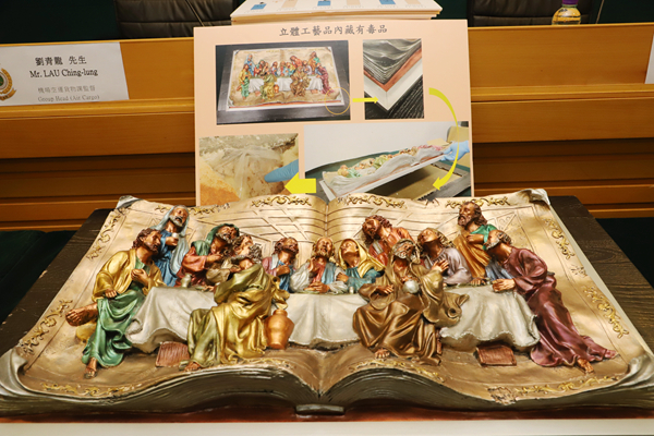 海關展示檢獲一個「耶穌最後的晚餐」立體工藝品內藏毒。記者區天海攝