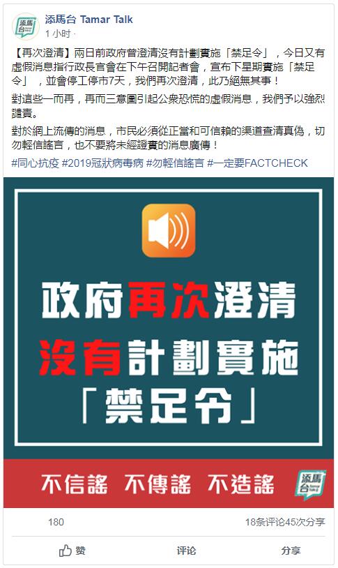 贴文指,兩日前政府曾澄清沒有計劃實施「禁足令」,今日又有虛假消息指行政長官會在下午召開記者會,宣布下星期實施「禁足令」 ,並會停工停市7天,我們再次澄清,此乃絕無其事!