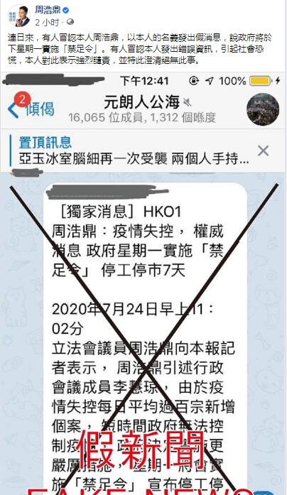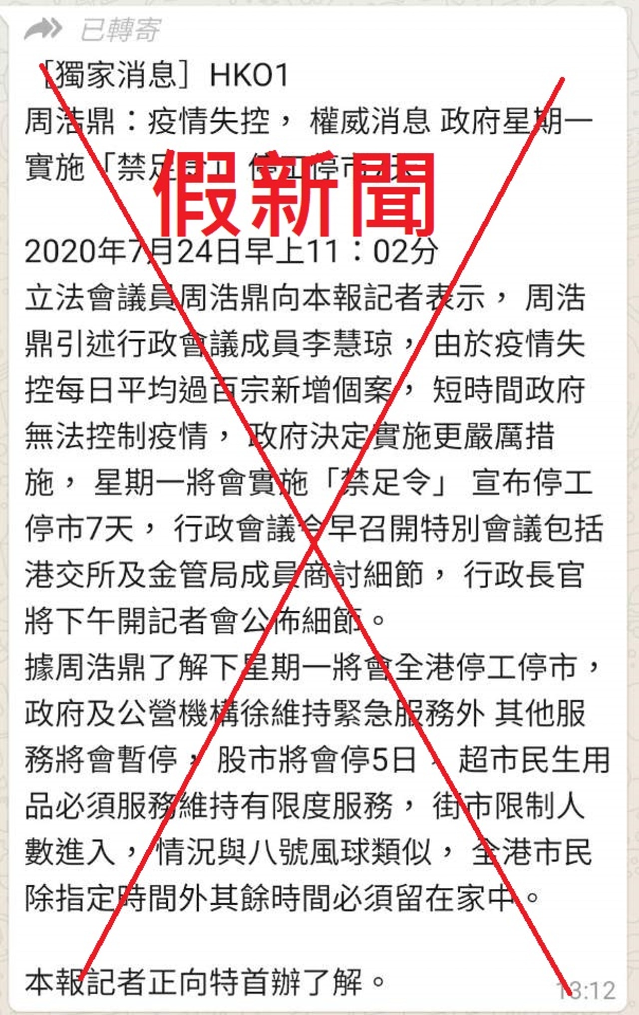 本港网媒《香港01》指,網上有人盜用《香港01》名義發放假新聞,透過Whatsapp等手機應用程式謠傳《香港01》引述民建聯立法會議員周浩鼎指疫情失控,並引述權威消息稱政府星期一實施「禁足令」,停工停市7天。