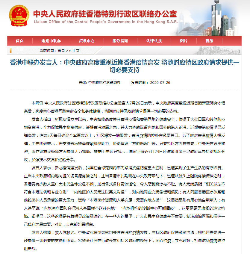 中央人民政府駐香港特別行政區聯絡辦公室發言人7月26日表示,中央政府高度重視近期香港新冠肺炎疫情高發,高度關心香港同胞生命安全和身體健康,將隨時應特區政府請求提供一切必要的支持。