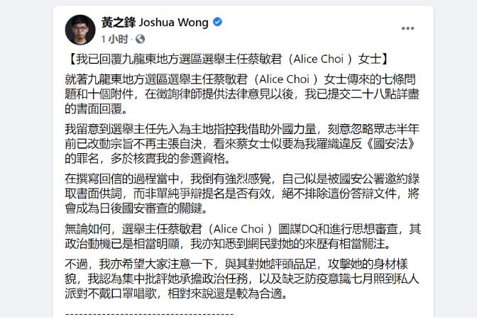 【香港商报網訊】參選立法會九龍東選舉的亂港分子黃之鋒,今日在社交網站上表示已回覆選舉主任蔡敏君的查詢,強調無意推動「民主自決」的主張。