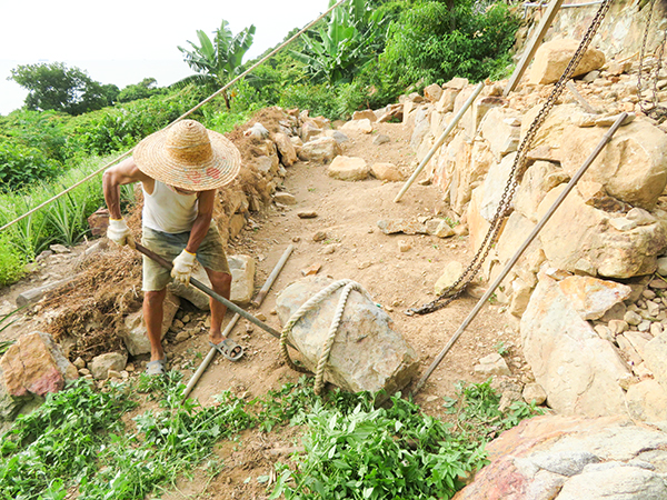 年逾古稀的木易叔叔,幾乎每天都像古時的愚公,移動石頭。黃山說,他的毅力很驚人,而成品很優秀,前年颱風山竹來襲,石頭牆絲毫不受影響。