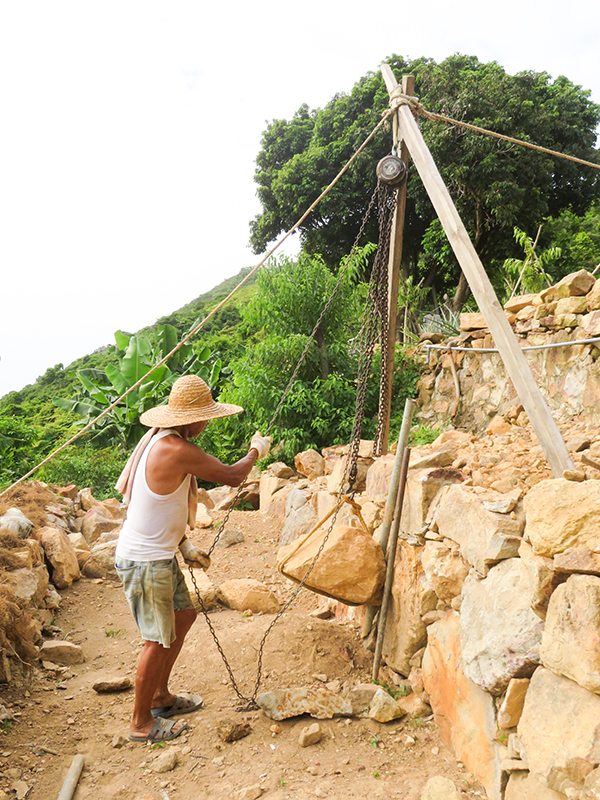 他居住的山坡有很多大石頭,想當年做石頭牆也是因地制宜,但這麼巨大的石頭如何搬動?原來效法古人,應用槓桿原理搬石。正好木易叔叔要搬動兩塊分別重約500斤及700斤的石頭到平台。現場有這樣的器械裝置,倒V形木柱,中間裝有滑輪,滑輪尾部有大钩,可勾緊繫着繩子的石頭,木柱頂有粗繩,一邊牢固在屋前的斷樹,一邊牢固在下面山坡的石頭,只見他一會兒拉動兩邊的繩,一會兒搬動木柱,之後拉動滑輪,石頭就前進了幾分,若石頭距離木柱過遠,他又會用鐵杆撬動地上的石頭,以接近大钩。這些工序來來回回多次,終於在一個多小時內將兩塊石頭搬到平台。