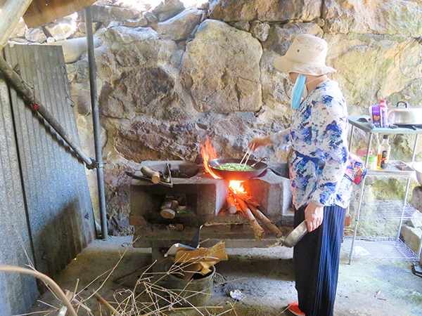 木易叔叔的家在斜坡上,要走一小段上坡路,今趟幹活是在路兩旁種植觀賞植物,它們是紅鐵樹及青鐵樹的樹苗,近路口會種簕杜鵑,如此栽種全是黃山的主意,「這些樹長大了會好靚,紅紅綠綠,打卡最啱,港人最鍾意,影完相行去木易叔叔度,睇下石頭牆,口渴時幫襯買支飲品」,上坡路旁的草叢地,一些已開墾,種了番薯、仙人掌、香蕉、木瓜、南瓜等。