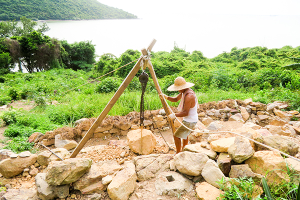 石頭巨牆及平台的創造者木易叔叔,皮膚黝黑、一臉鄉土氣息。他說,70年代由內地來到二澳,在這裏起屋,見土地有好多石頭,就拿來做石頭牆,可以擋着上面落下來的水及石。屋及石頭牆花了約三年時間建造,全由他一力承擔,1976年屋做好,但沒多久,為生計、家人,到了城市裏打工,只間中回來看看。2017年,他退休了,難忘鄉土,回來長住,重拾砌石頭牆技藝,做起平台來。