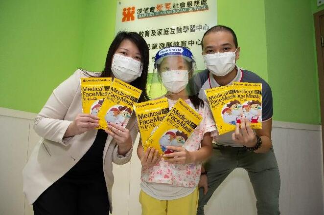 浸信會愛羣社會服務處兒童、青少年及家庭服務總監周靄婷(左一) 感謝新世界捐贈1萬隻兒童口罩,將會分發予基層家庭及有特殊教育需要的兒童。