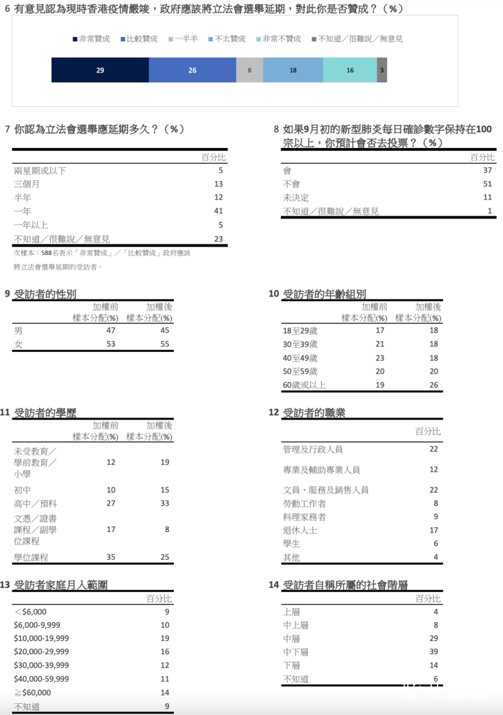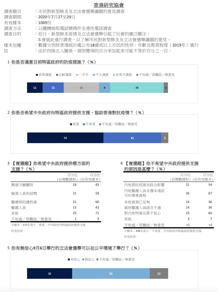 【香港商報網訊】近日,新型肺炎疫情及立法會選舉引起了社會的廣泛關注。香港研究協會就此於7月27至29日展開全港性隨機抽樣電話訪問,成功訪問了1069名18歲或以上市民。調查結果顯示: