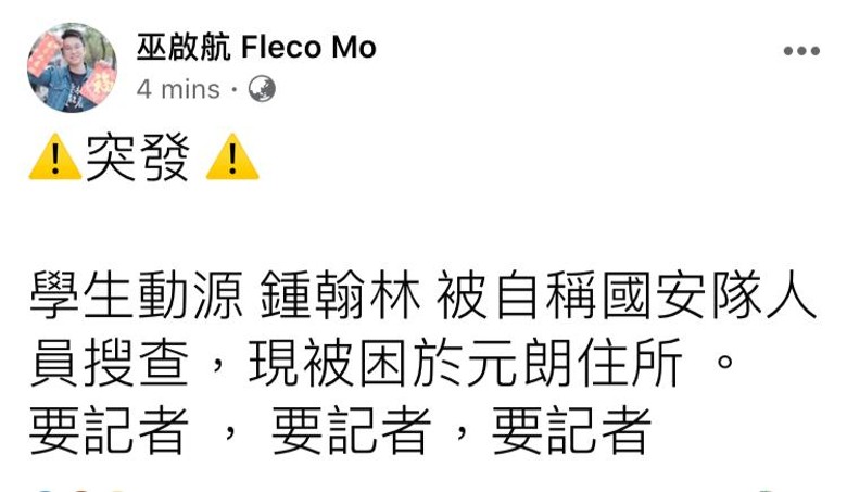 早前,巫啓航晚上在社交媒體專頁發文指,鍾翰林被警方搜查住所。直到晚上近9時,鍾翰林被扣上手扣,被帶上一部7人車離開,涉嫌違反港國區安法中的「煽動他人分裂國家」。學生動源則發文指,鍾翰林在元朗住所被拘捕,警方在場帶同數袋證物離開。