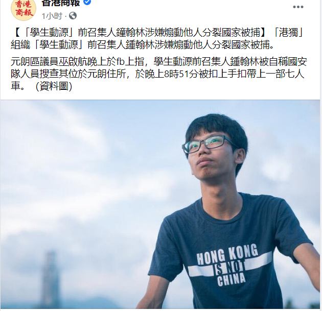 「學生動源」前召集人鐘翰林涉嫌煽動他人分裂國家被捕