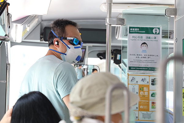 香港市民加強防護,有乘客戴兩個口罩再加游泳鏡。香港中通社