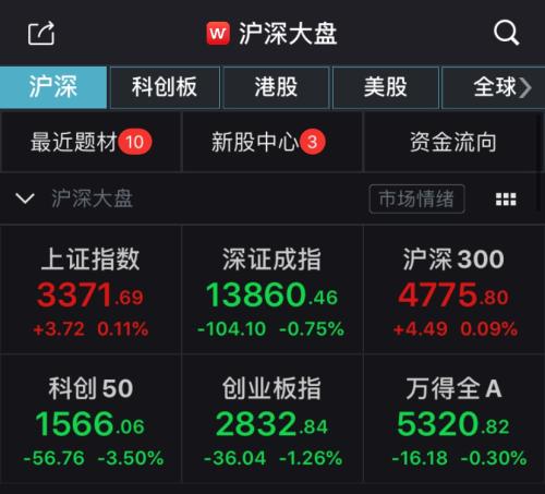 【香港商报网讯】4日,沪深两市开盘之后一度震荡走弱,随后在银行、券商等金融股的带动下,沪指快速拉升,创业板指则跌幅较大。午后沪指震荡回升,创业板指跌逾1%。截至收盘,沪指报3371.69点,涨幅0.11%,成交额6049.42亿元;深成指报13860.46点,跌幅0.75%,成交额7605.62亿元;创业板指报2832.84点,跌幅1.26%。