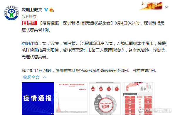 截至8月4日24时,深圳市累计报告新冠肺炎确诊病例463例。目前在院1例。