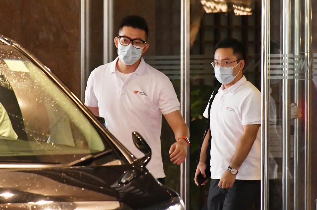 身穿華大基因旗下「火眼實驗室」衣服的工作人員,日前於內地核酸檢測支援隊下榻的九龍維景酒店出入。資料圖片
