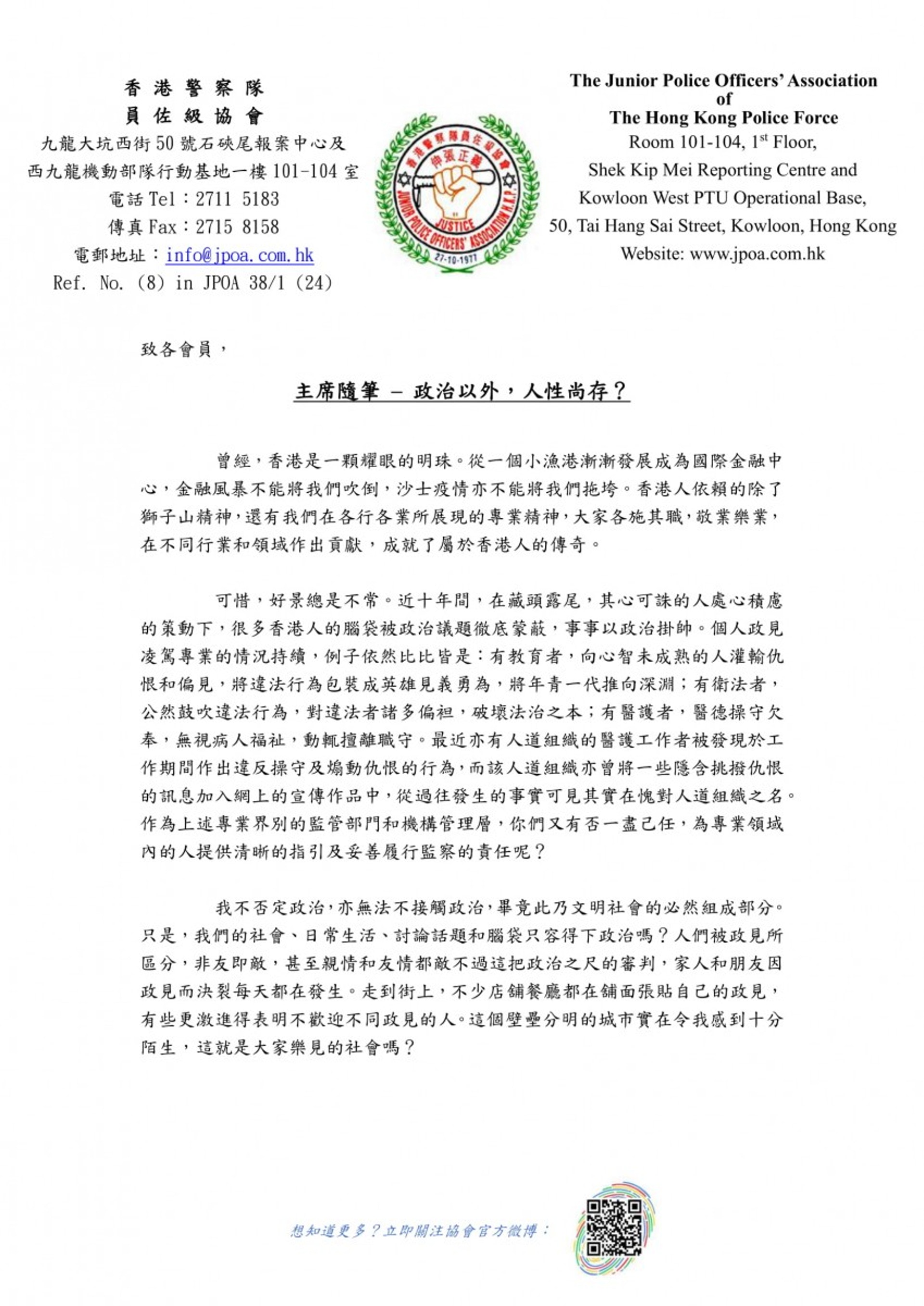 【香港商報網訊】香港警察隊員佐級協會主席林志偉今日(5日)以「政治以外,人性尚存?」為題發表文章,指在藏頭露尾、其心可誅的人處心積慮策動下,很多香港人的腦袋被政治議題徹底蒙蔽,事事以政治掛帥。他批評有專業人士將個人政見凌駕專業,未能盡到自身責任。