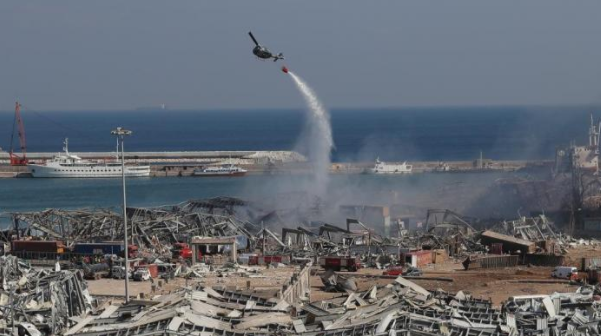 黎巴嫩首都贝鲁特港口区4日发生剧烈爆炸。图为军用直升机在爆炸现场洒水。