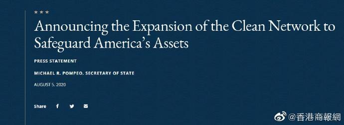 彭博社称,蓬佩奥宣布的「清洁网络」指南并没有发出最後通牒,也没有约束力,但它代表着特朗普政府正努力升级对中国科技公司的限制。