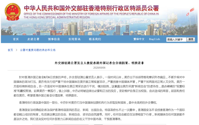 【香港商报网讯】针对香港外国记者会8月6日发表的声明,外交部驻港公署发言人表示,一段时间以来,美方出於冷战思维和意识形态偏见,不断升级对中国媒体的政治打压。美方有关行径严重干扰中国媒体在美开展正常报道活动,严重损害中国媒体声誉,严重干扰两国间正常人文交流。发言人指,美方一方面标榜新闻自由,另一方面却对中国媒体在美正常採访进行干扰、横加阻挠,这暴露出美方所谓「新闻自由」的虚伪性,是赤裸裸的「双重标准」和霸权欺凌。如果美方一意孤行,错上加错,中方必将被迫做出必要和正当的反应,坚定维护自身正当权益。由此造成的局面,起因和责任都在美方。希望香港外国记者会分清因果、明辨是非。