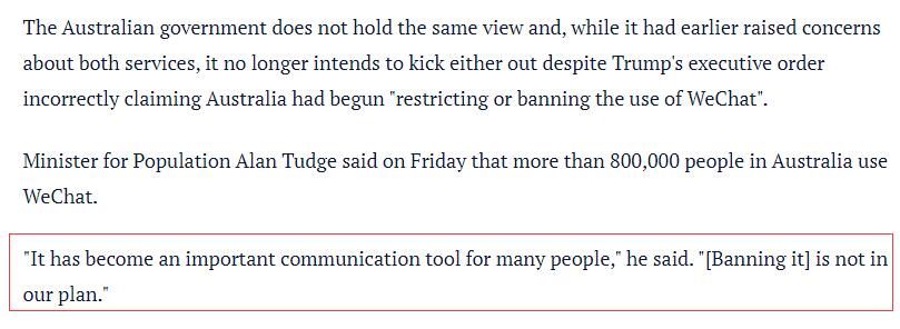 澳大利亚政府对此持不同意见,据悉尼先驱晨报(The Sydney Morning Herald)报道,当地时间8月6日,澳大利亚联邦代理移民部长艾伦·塔吉(Alan Tudge)表示澳政府并不会禁用微信。他称,澳洲有超过80万人使用微信,他深知微信的重要性。