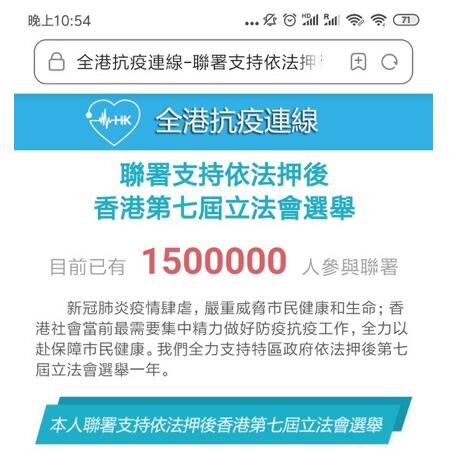 【香港商报网讯】全港抗疫連線於7月31日至本月7日期間,設立網站呼籲全港市民聯署,支持特區政府依法押後第七屆立法會選舉,截至8月7日晚上 23:00,已錄得有效聯署人數超過150萬。