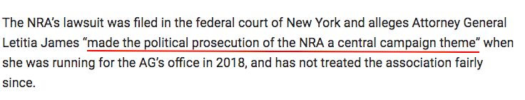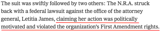 面對“訴訟”,美國全國步槍協會直接鬧到了紐約聯邦法院,向紐約總檢察長提起訴訟 ,“罪名一樁樁一件件”。其中就提到↓↓