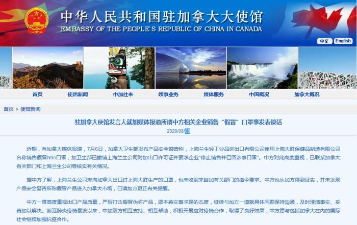 近期,有加拿大媒体报道,7月6日,加拿大卫生部发布产品安全警告称,上海兰生轻工业品进出口有限公司使用上海大胜保健品制造有限公司名称销售假冒N95口罩,加卫生部已撤销上海兰生公司对加出口许可证并要求企业“停止销售并召回涉事口罩”。中方对此高度重视,已联系加拿大有关部门和上海兰生公司等核实有关情况。