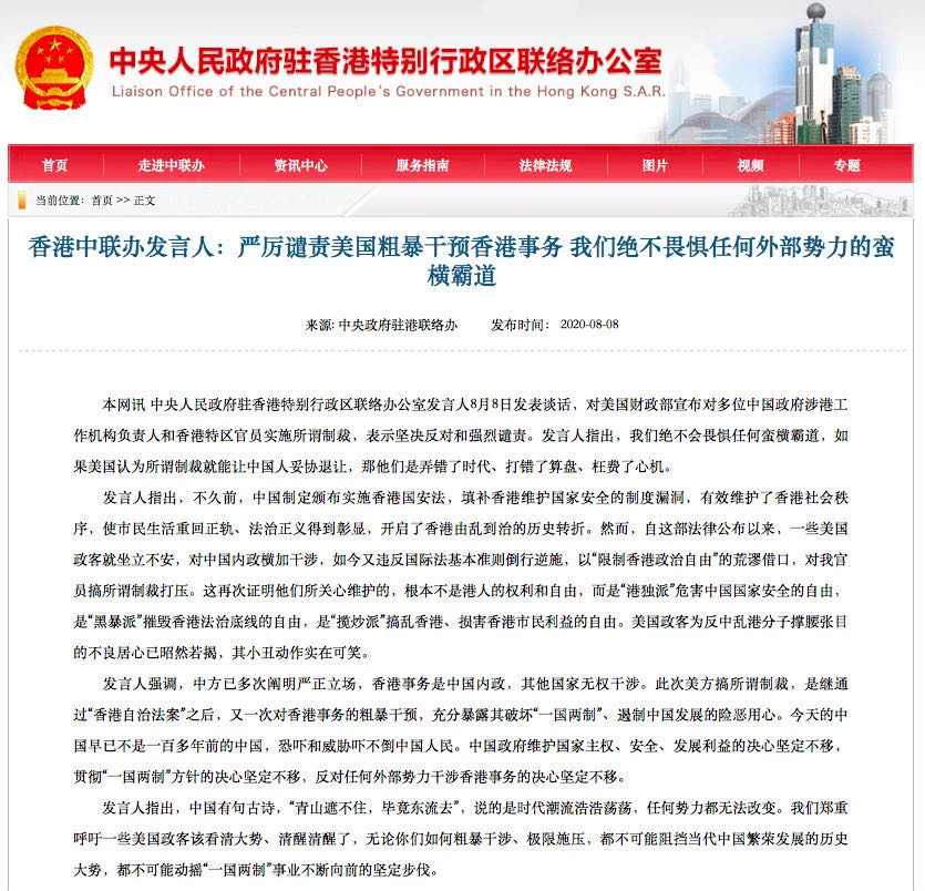 【香港商報網訊】中央人民政府駐香港特別行政區聯絡辦公室發言人8月8日發表談話,對美國財政部宣布對多位中國政府涉港工作機構負責人和香港特區官員實施所謂制裁,表示堅决反對和强烈譴責。發言人指出,我們絕不會畏懼任何蠻橫霸道,如果美國認爲所謂制裁就能讓中國人妥協退讓,那他們是弄錯了時代、打錯了算盤、枉費了心機。