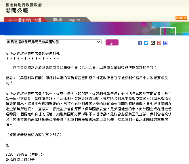 【香港商報網訊】美國政府周五公布對林鄭月娥等11名香港和內地官員實施制裁,屬十分無恥的“長臂管轄”和對中國內政的赤裸裸幹涉。商務及經濟發展局局長邱騰華今日(8日)在電台節目上批評,美國做法是十分無理、雙重標準及橫蠻,粗暴幹預本港事務。