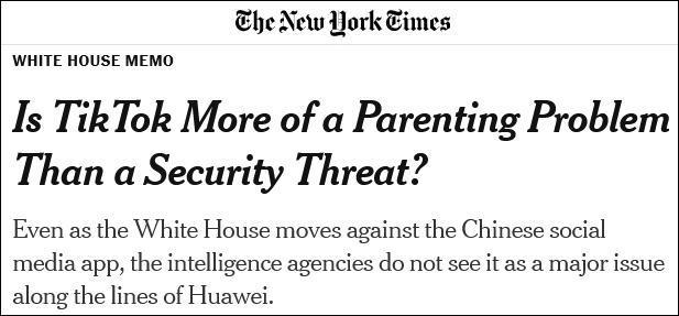 报道中还提到,此次特朗普政府针对TikTok和微信的禁令,是自去年采取措施禁止美国公司使用华为的通讯设备以来,程度最严重的一次。但《纽约时报》援引一部分情报官员的话称,TikTok构成的“威胁”和华为制造的“威胁”一比较,就显得“相形见绌”了。