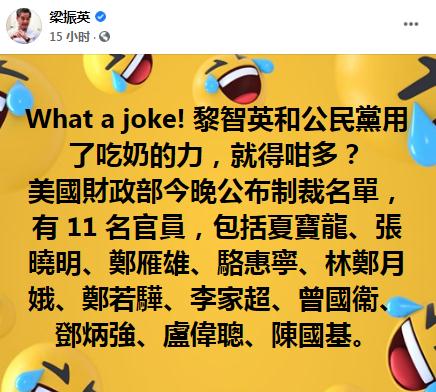 【香港商報網訊】美國財政部昨日(7日)稱對香港特區行政長官林鄭月娥等11名中國內地及香港官員實施制裁。香港特區前行政長官梁振英7日晚間在臉書對此發文諷刺:“What a joke! (真是笑話!)黎智英和公民党用了吃奶的力,就得咁多?(就得到這麽多?)”