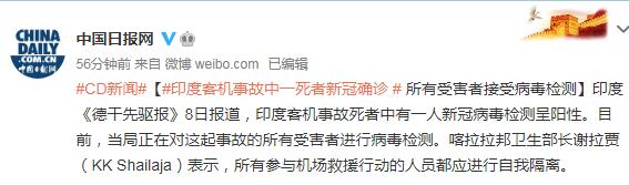 【香港商报网讯】印度《德干先驱报》8月8日报道,印度客机事故死者中有一人新冠病毒检测呈阳性。目前,当局正在对这起事故的所有受害者进行病毒检测。喀拉拉邦卫生部长谢拉贾(KK Shailaja)表示,所有参与机场救援行动的人员都应进行自我隔离。