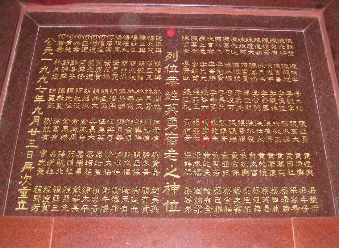 十八鄉天后廟英勇祠內的雲石碑。圖右方自上而下第四排見紅圈所示為張步高。