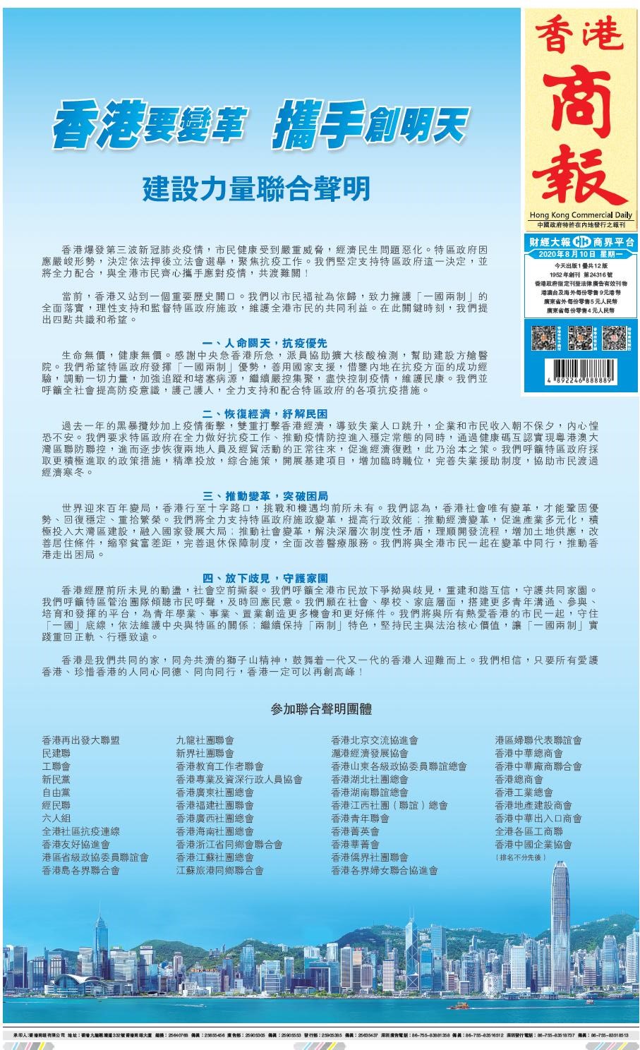 【香港商報網訊】記者馮煒強報道:香港再出發大聯盟、民建聯、工聯會、新民黨、自由黨、經民聯、全港社區抗疫連線等42個建制團體發起的「建設力量」,昨日發表「香港要變革 攜手創明天」聯合聲明,致力擁護「一國兩制」全面落實,理性支持和監督特區政府施政,並提出四點共識和希望,冀特區發揮「一國兩制」優勢,善用國家支援,盡快控制疫情,恢復經濟,紓解民困。