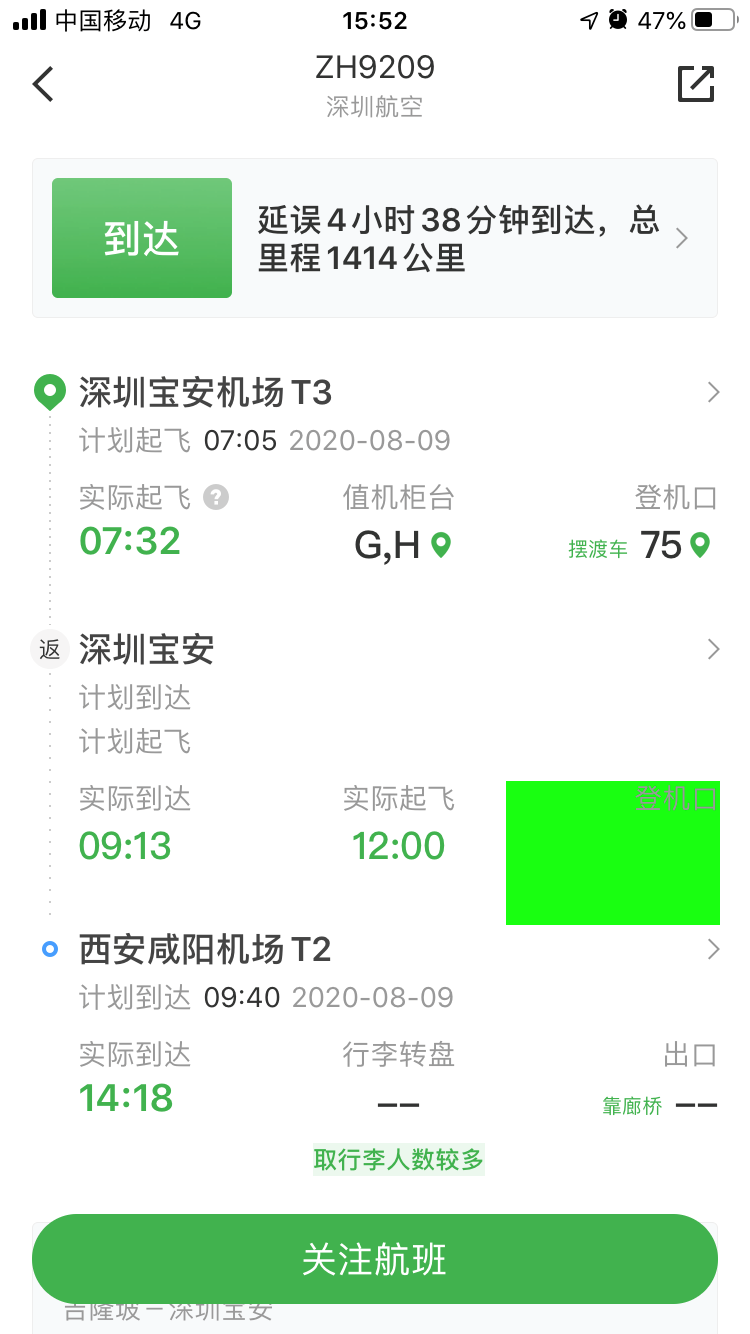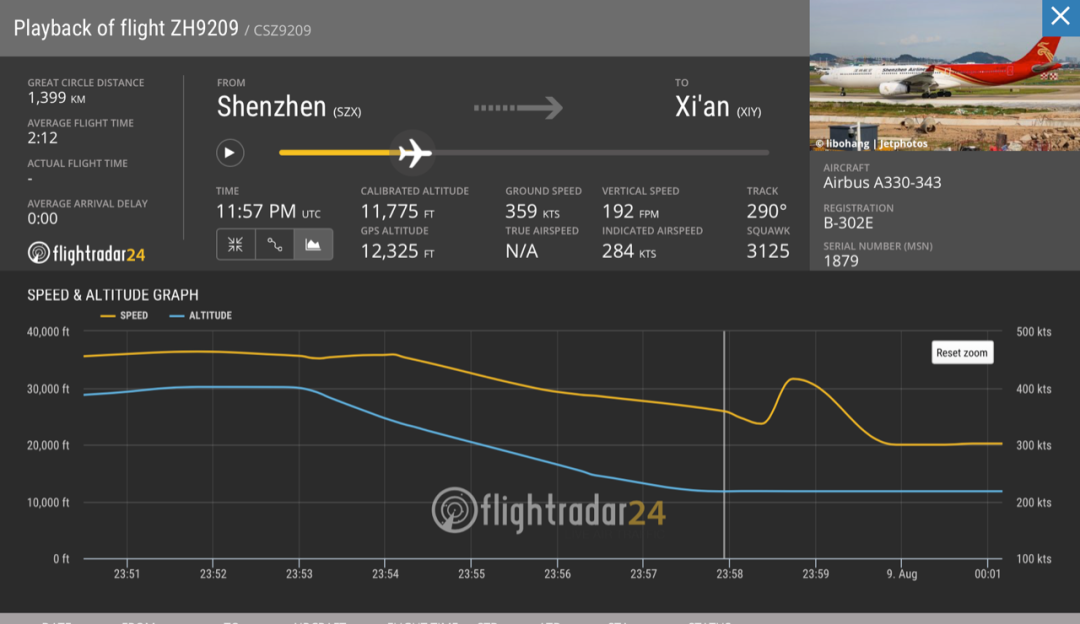 深航空客330飞机执行ZH9209(深圳-西安)航班,飞机于07:32深圳起飞。