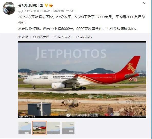 另外,微博名为@资深机长陈建国 的博主也表示,飞机在高空大速度巡航的时候,如果立即执行9800英尺每分钟下降,也就是2分钟下降6000米,飞机大概率会因为超速而面临解体的危险。