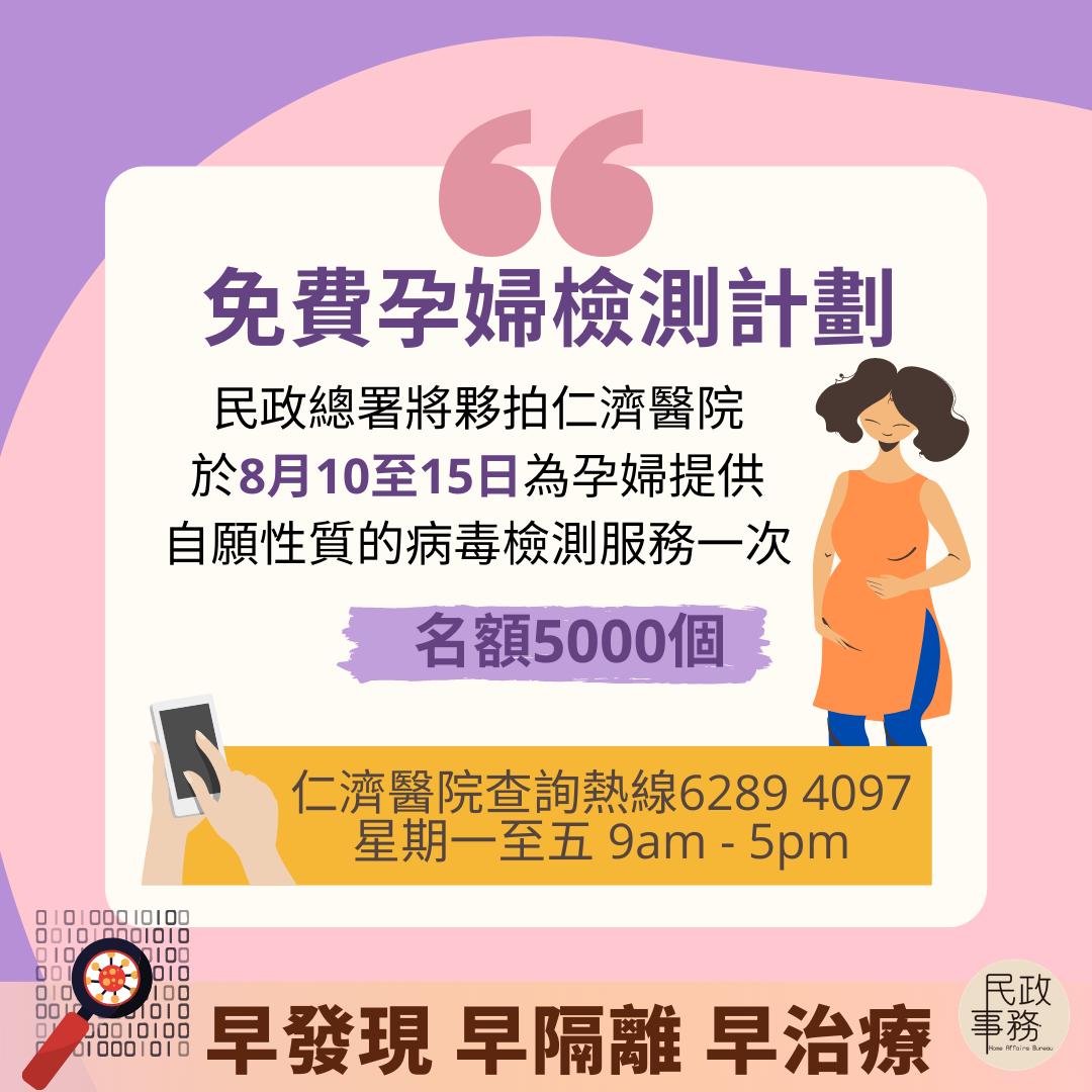 民政總署今日(10日)起與仁濟醫院推出孕婦檢測計劃,于11個指定派發地點向孕婦(或由其家人代領)派發檢測登記表格和咽拭子采樣套裝,有關人士領取測試套裝時須出示參與檢測的孕婦懷孕證明,名額5000個。
