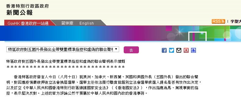 【香港商报网讯】港府發言人今日(八月十日)就澳洲、加拿大、新西蘭、英國和美國外長(五國外長)發出的聯合聲明,對因應疫情嚴峻押後立法會換屆選舉、選舉主任依法履行職責就個別立法會選舉候選人提名是否有效作出決定,以及訂立《中華人民共和國香港特別行政區維護國家安全法》(《香港國安法》),作出指鹿為馬、蔑視事實的指控,表示堅決反對。上述的官方評論公然干預屬於中華人民共和國內政的香港事務。
