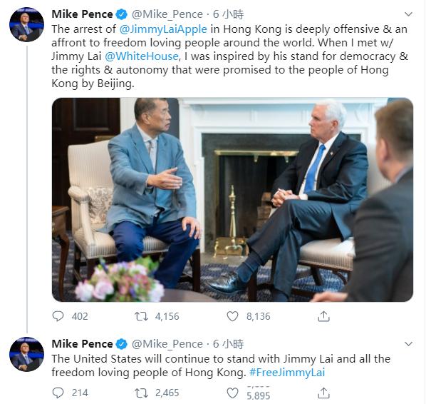 美國副總統彭斯在社交網站發文,指壹傳媒創辦人黎智英等10人被捕,是對全球熱愛自由人士的嚴重冒犯和侮辱。彭斯上載他去年7月在白宮接見黎智英的照片,說對黎智英在民主、人權和自治的立場深感鼓舞。