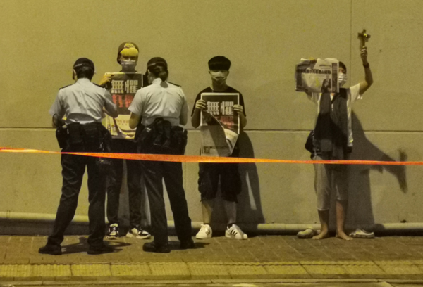 記者注意到,有人在現場叫囂,隨後警員出現,以違反限聚令對他們進行搜查。